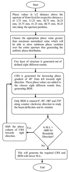 - Step 7: Check for SLL whether it is higher than −8 dB. If it is higher, then shift the phase column towards the right direction, which will generate new phase values for CRS and consequently for BDS. Repeat Step 5 until a lower side lobe level of −8 dB is obtained.