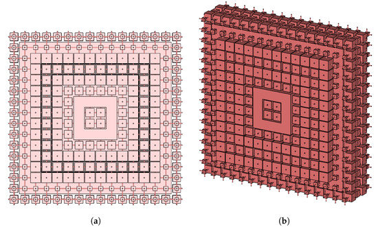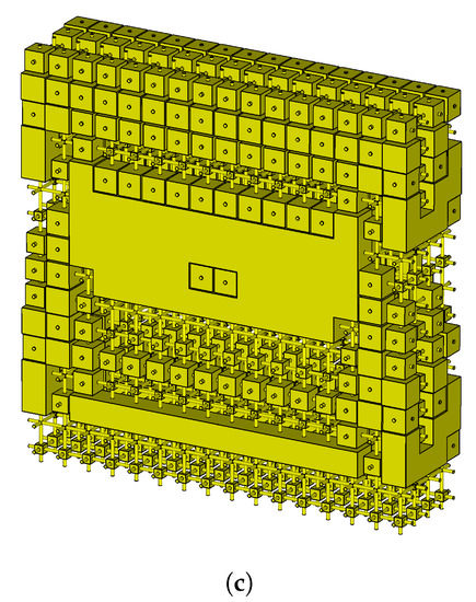 - Step 3: Generate the five-layer structure of the proposed cubes with eight different rounds that will be able to decrease the overall phase variation along the defined aperture of 16 × 16. Thus, appropriate cubes sizes are selected for defined aperture positions by giving the command from Matlab, which is interlinked with Computer Simulation Technology (CST) software.