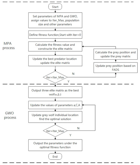 The MPA-GWO algorithm flow is shown in Figure 2.