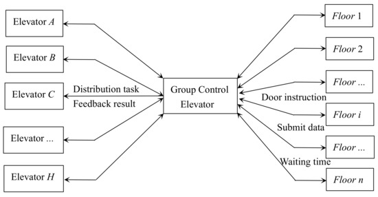 The operation model of the elevator group is similar to the single elevator, but the number of elevators is increased, and the collaborative optimization algorithm is embedded. The traditional group control algorithm has difficulty dealing with the situation of high speed, high frequency, and many random users. However, our method can deal with this kind of the problem very well. Our algorithm fully considers the randomness of passengers booking the elevators, and the mutual coordination between them, distance optimization, time constraints, and other conditions. Therefore, our algorithm can cope with more complex application environments, such as excessive human traffic, frequent up and down demands, and rapid data changes in a short period of time. The logic control and data feedback inside the elevator group are shown in Figure 4 below.