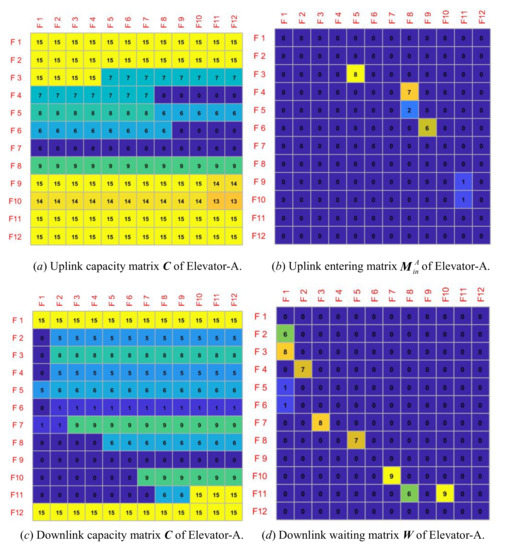 - Capacity matrix load limiting formula.The elevator moves upward, and the initial iteration value is , . Ultimately, each element of the capacity matrix corresponds to each bit (within the time limit) that is authorized to take the passenger .Whether the elevator moves up or down through each floor, the elevator available space between empty and full load, the internal elements of the capacity matrix satisfy the relationship: