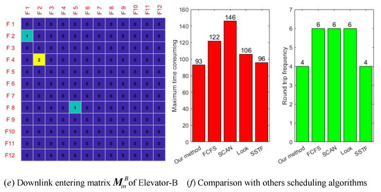 - When the elevator moves upward.The total number of people allowed to enter through each layer must be less than the maximum load of the elevator; the mathematical expression is:At the first iteration, the elevator is ready to go up and handle the reservation tasks on the first floor, and the initial value of the iterative algorithm satisfies the following relationship: The remaining matrix =, the waiting matrix , and the entering matrix , are given here. are the elevator space judgment functions. As long as the users are not overloaded, the first floor users will be allowed to continue enter.Stop is a subscript index of the entering matrix ; it means that the elevator has enough space for some users who from current floor to use it. Output the index number , stop, stop that meets the judgment of elevator capacity. After the first iteration, the remaining tasks are assigned to the second iteration , and the following relationship exists between the iteration matrices:When the number of iterations is , the iteration from the second floor to the n-th floor.Expanding Formula (29), a more detailed iterative formula can be obtained.It should be emphasized that the elevator space judgment function from the second floor to the n-th floor is different from the judgment condition of the first floor, where is the loadable space when the elevator reaches the floor; the detailed solution process can be referred to Section 2.2.4.Finally, to the nth floor, we need to determine whether is a zero matrix or not. If so, it means that all users with upward demand are loaded, and the task is completed. If is a non-zero upper triangular matrix, it means that there is still a residual tasks. According to the iterative algorithm, it enters the next cycle until is a zero matrix. The above is the upward iterative optimization algorithm of the reservation matrix. For the downward iterative algorithm, it is similar to the upward process.