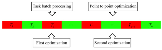 Furthermore, the advantages of the reservation elevator matrix iteration algorithm are high coordination, fast response, batch process, and adaptive function. Adding face recognition technology to the system can also improve the stability of the algorithm. The deficiency of this model is that our algorithm considers task batch distribution at both ends of the booking floor and does not consider the second point-by-point optimization [47,48]. When the number of reservations increases sharply, the difficulty of optimization and the amount of calculation are increased. In fact, with dynamic redistribution of elevator tasks, there is still room for optimization and improvement. If the second point-by-point optimization is opened, the utilization rate of the elevator will be higher, but the elevator should feedback the position, available space, and unfinished tasks in time whenever it passes through each floor; these tasks will also increase the amount of calculation. The schematic diagram of the two optimization cycles is shown in Figure 8.