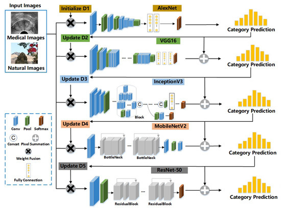 Based on the basic concept of ensemble learning, we try to aggregate multiple CNNs into a strong image classification model [1,47,48]. However, unlike traditional ensemble learning methods or Adaboost CNNs [38], which consist of the same type of sub-networks that are indiscriminately trained and tested, our HCNN consists of several different types of CNNs as the sub-networks, and these sub-networks are trained progressively in order. In this paper, we choose Alexnet [10], VGG16 [11], Inception V3 [49], Mobilenet V2 [50], and Resnet-50 [12] as the basic sub-networks (see Figure 1). In addition, there are no limits on the number of sub-networks and their types. At the training stage, images are assigned weights to express the difficulties encountered by models in accurately classifying them. If an image can not be accurately classified by a sub-network, its weight will be increased. Images with updated weights are then input into the next sub-network for extracting more abstract and effective visual features. In this section, we will elaborate on HCNNs in more detail.