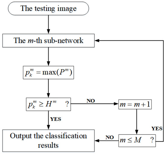 To test the proposed model, we need to provide a threshold for each sub-network so as to make the model output the final classification results. When image classification confidence in the m-th sub-network is higher than , this prediction is reliable; otherwise, the credibility of the image classification results is lower. Generally speaking, the values of can be set larger, which ensures that the difficult-to-identify images can pass through the subsequent sub-networks with more complex network structures. Figure 3 shows the simple process of image classification of HCNNs.