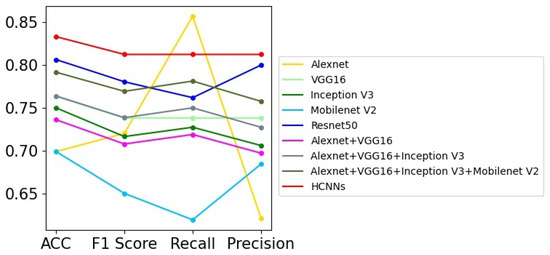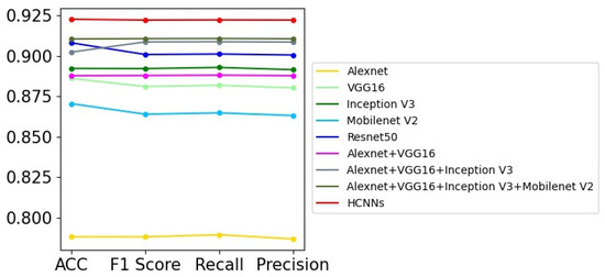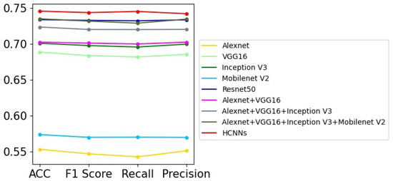 There are a large number of challenging chimpanzee facial images in the chimpanzee facial image dataset [25]; it is therefore difficult for models to achieve good image classification performance. In this paper, we implement nine different models on this dataset; the experimental results are shown in Table 3, where we can see that these models, which perform well on some public image classification databases, do not perform well on this chimpanzee facial image dataset. The model with the single network that works best is Resnet50, with 0.7336% accuracy, while the HCNN achieves the highest image classification accuracy of 74.55%. Figure 5 shows the curves of these models’ performance in related evaluation indicators, and it can be seen that the HCNN has general advantages over models with single neural networks and other models with multiple sub-networks in terms of F1 score, recall, and precision, which clearly demonstrates its effectiveness and superiority.