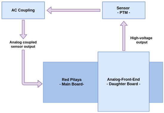 A coupling capacitor isolates the high-voltage signal (as done in [49,50]) from the sensor’s output signal, allowing the PMT to be connected to the low-voltage filtering and amplifying stage within the main board. By taking advantage of the ADC and antialias network integrated in the Red Pitaya board, only a 50 terminator is added in parallel at the end of the coaxial cable that carries the signal from the PMT to the board, in order to match impedance. This signal is directly fed into the integrated ADC signal chain within the Red Pitaya, starting with the low-pass antialias filtering (with a −3 dB cutoff frequency of 50 MHz) and a 14-bit 125 MHz single-ended analog-to-digital converter.