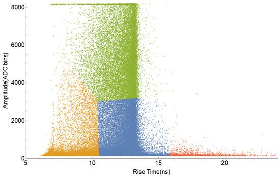 Some feature extraction was performed in the incoming signal to obtain the rise time (10% to 90% of the output step height) and the amplitude needed to discriminate among the different types of signals. In Figure 2, a typical distribution of the pulses captured by the DAQ is presented. To have an objective classification criteria, we run a k-means clustering algorithm of four partitions (Figure 3) to select the border parameters to differentiate the signals. To stay in the safe zone, in this experiment, only the central portions of the muon and of the electron clusters have been used to label the data selected for the supervised training.