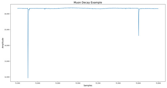 To validate our criteria, we study the physics of the muon decay phenomenon [56]. The muon mean lifetime is ~2.196 µs, and it was used to determine the reference pulses corresponding to a typical muon and electron. Because charge must be conserved, one of the products of muon decay is always an electron. This can be used in such a way that pairs of pulses whose time difference fits the model were searched to use as reference, as we can observe in Figure 4. This procedure has been used in other context to measure muon half-life [57].