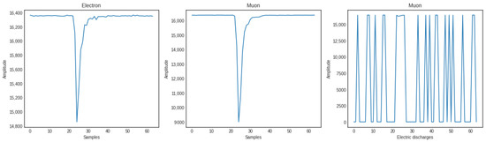 Based on this information, the training data set was generated. The ground truth for each pulse is indicated by adding an extra column, with an identification value for each type of signal: 0 for electron, 1 for muon and 2 for electric discharge, as shown in Figure 5.