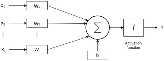 An artificial neural network (ANN) [58] is composed of neuron (or node) interconnections arranged in different layers, usually an input layer, middle or hidden layers and the output layer, where a prediction is generated. The connections between the neuron and the inputs () are called weights (). Each node has several inputs and only one output, and the ANN uses a nonlinear activation function to compute the output value. This description can be observed in Figure 6 and is mathematically represented by Equation (1).