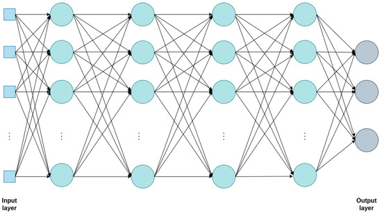 The multiclass classification problem is based on distinguishing three types of pulses: muon, electron and electric discharges from the raw signals. The neural network was designed and implemented using the open-source software library Keras [59] with TensorFlow [60] as back end. The architecture is based on dense layers with four hidden layers and can be seen in Figure 8.