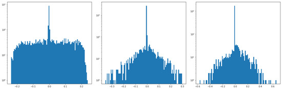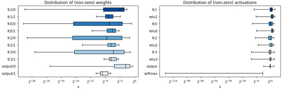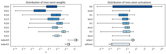 The bit precision for weights and bias to train using QKeras was selected based on the profiling provided by hls4ml. Once the base model was obtained using TensorFlow+Keras, it was compiled using the package to analyze the weights and bias precision. The profiling obtained is presented in Figure 9.