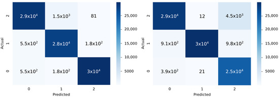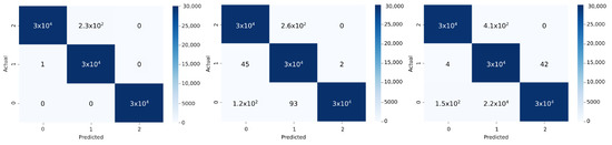 During the training, we implemented k-fold cross-validation, which leads us to use folds as training data, with . The training parameters were configured as follows: batch size: 512, epochs: 32, optimizer: Adam [61] with a learning rate equal to 0.0001. To obtain the final model, three training stages were performed, keeping the base parameters: