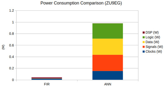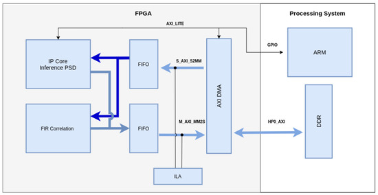 Some implementations, such as adaptive FIR filters, are used for linear prediction to reduce narrow band radio frequency interference in cosmic rays [40]. They improve the signal-to-noise ratio by calculating the covariance of the noise to identify undesired frequency components from external noise and later adapting the coefficients of the FIR filter in the front-end electronics. The authors calculated the covariance using the FPGA and later the microprocessor to calculate the new set of coefficients. The authors concluded that the linear predictor is a viable alternative to other methods such as digital notch filters or multiple time-to-frequency domain conversion using FFT.