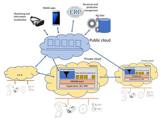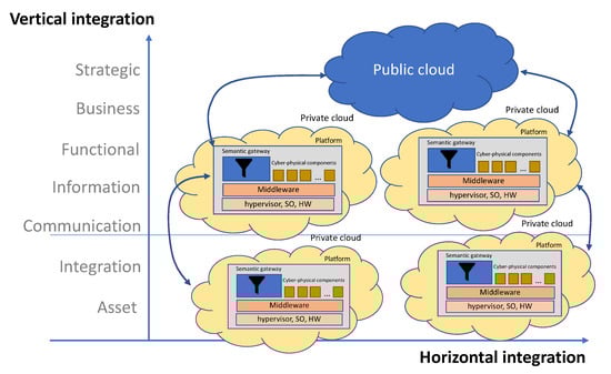 For a satisfactory integration between the cyber-physical level and the information integration level, we propose the development of gateways between levels that make compatible the different quality of service requirements and offer solutions for information management according to the chosen computational deployment pattern—including private cloud and public cloud systems (Figure 1). It is essential to develop information conversion and integration models that, through automatic processing technology, prepare the information according to the context in which it will be used.