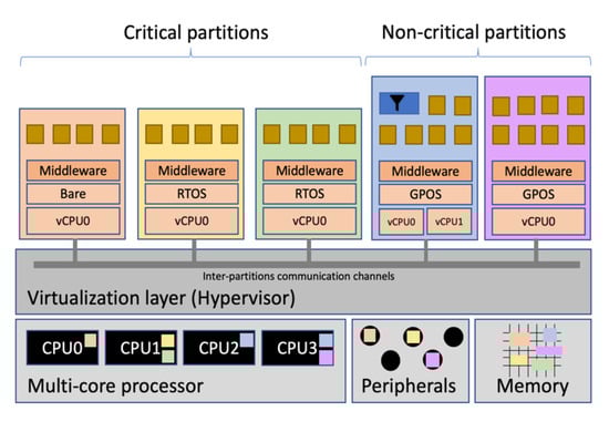 In [16], RTA-HV is used to provide virtualization support for a multicore hardware platform for the automotive industry. In [17], VOSYS monitor is used as virtualization technology, a multi-core software layer, which allows the co-execution of a safety-critical real-time operating system (RTOS) and a noncritical general purpose operating system (GPOS) on the same hardware ARMv8-A platform. Last release (v2.5.0) is ASIL-C-ISO 26,262 certified [18]. A hypervisor for a mixed criticality on-board satellite software system is discussed by Salazar et al. in [19].