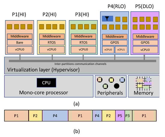 Figure 4. Example of a system with 5 partitions and different criticality levels. (a) architecture and (b) CPU allocation.