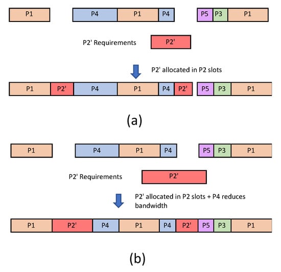 Figure 5. Two scenarios of changes in P2 requirements: (a) P2′ requirements are enough to be allocated in P2 slots. (b) P2′ requirements need also that P4 reduces its allocation.