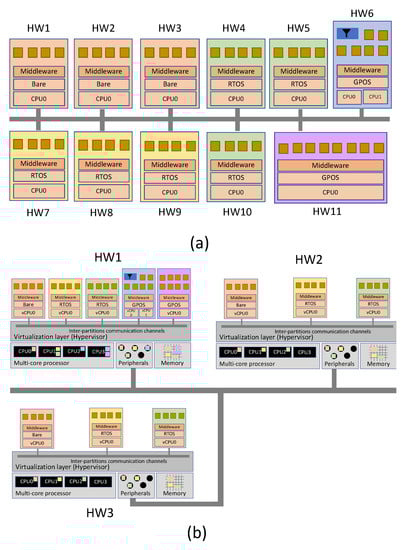 In addition to ensuring the isolation of critical systems, it is also necessary to manage redundancy. Traditionally, distributed control systems have managed redundancy by replicating the hardware platform, as shown in Figure 6a. In this example, a triple redundancy of critical systems is considered necessary. This redundancy requires the deployment of 11 hardware platforms. The power of the current execution platforms enables the use of virtualization as presented in Figure 6b so that only three hardware platforms are required. This configuration offers multiple advantages: Lower cost; less deployment effort; reduction of cabling; and, in general, greater simplicity since part of the complexity managed by hardware is managed by software.