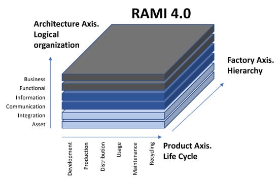 To achieve true interoperability and reconfiguration between elements produced by different manufacturers, it is essential to establish reference models that define the architecture of a digitized industrial system. The association “Industrie 4.0”, in Europe [36] proposed the Reference Architecture Model for Industry 4.0 (RAMI) model that provides architectural guides at all levels of an industrial system. The RAMI model is organized in three axes [37] where the main axis, “the factory”, represents the classical hierarchical levels of the physical organization of the production system as set out in ISA-95 and, more specifically, the models for integration as defined in IEC 62264. The second axis, “layering”, indicates the context in which information is produced or used. This axis represents the logical organization of the industrial system from the product through the means of production to the business processes. The third axis, “the product”, indicates the life cycle of the product and highlights the importance of managing production as well as design, development, and possible recycling, and the residual value or environmental impact of a product at the end of its useful life.