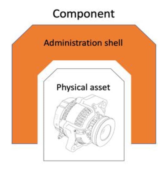 From the point of view of software organization, the RAMI reference model (Figure 7) proposes an architecture based on services whose interfaces, information models, and meta-models are driven by standards (IEC 61369, IEC 62,264 IEC CDD) [38,39] that enable their precise interpretation. The basic element of the architecture is the “asset”, which represents an object that has value for the company, and its software representation, the “management shell” that organizes the properties and functions of the asset from different points of view. The combination of the asset with its management shell forms the “component” in the context of Industry 4.0. See Figure 8.