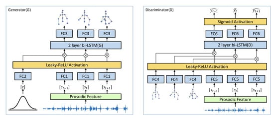 The notation used in the rest of this article is as follows: for a speech segment of length T, the features extracted from the audio signal are . The sequence of absolute positions of each joint in three-dimensional (3D) space is , where , and K is the total number of joints. The problem of generating gesture from speech can then be defined as to parameterize a model G by a parameter set such that . Furthermore, we aim to model the conditional distribution conditioned on the distribution . To achieve this, the model takes a random variable z sampled from a normal distribution . Thus, the problem becomes one of finding a parameter set such that . The error between the parameterized distribution and the real distribution is defined as to optimize . A discriminator parameterized by is optimized to be the measurement of this error. The method of optimizing and is discussed in Section 3.3.