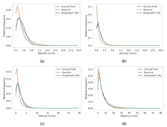 Motion dynamics (i.e., velocity) are imperative to human perception. As we aim to model the distribution of human gestures, one reason that the proposed model outperforms the baseline model is assumed to be that the velocity distribution of the motion generated by the proposed model is more similar to the ground truth than the baseline model is. We confirmed this assumption by plotting the histogram of the average velocity of all joints, shoulder, wrist, and hand: the histograms of the proposed model were more similar to the ground truth than those of the baseline, while the hand velocity distributions of both methods were comparable to the ground truth (Figure 2).