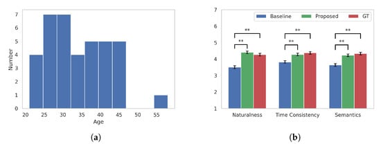 (a) Age distribution of participants. (b) Scores of each scale for different models. **: p < 0.002.