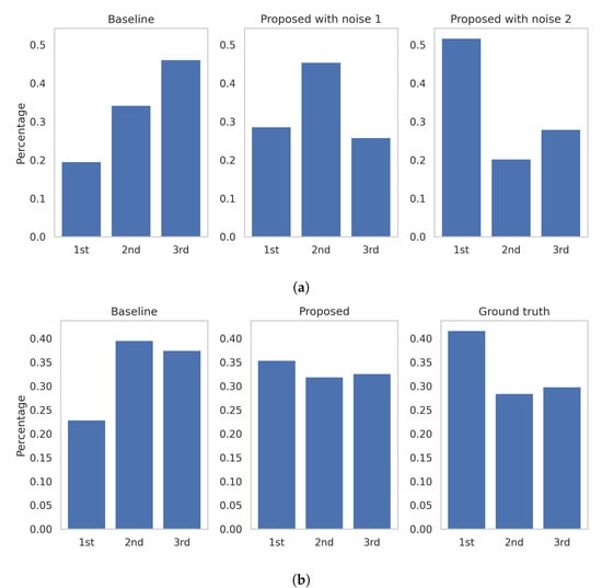(a) Ranking of results of baseline and proposed model with two different noises. (b) Ranking of baseline, proposed model, and ground truth.