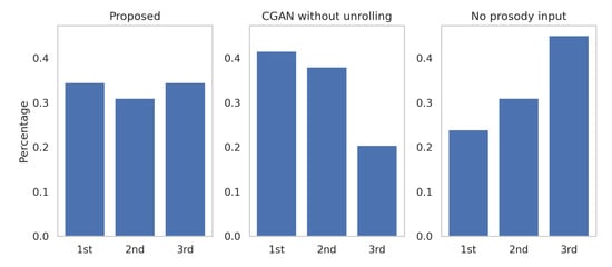 Ranking of the results of the proposed model, the conditional generative adversarial nets (CGAN) model, and model without prosody input for the discriminator.