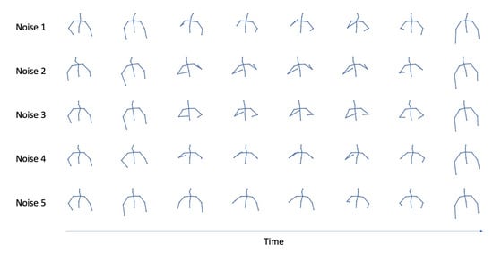 The noise vector controls the motion pattern. The results in Figure 6 show that the proposed model can be a controller of the movement pattern. Although we have not investigated much on this topic, disentanglement of the noise vector in the proposed model is worthy of future investigation.