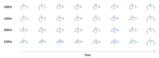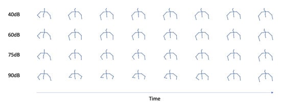 The reference values of f0 were set to 100, 150, 200, and 250 Hz. First, a sinusoidal wave signal of a certain f0 was generated. Then, using the trained model, motion sequences were generated. The corresponding results are shown in Figure 8. It is clear that the size becomes larger and the height of the hand becomes higher as f0 increases. Correlations were also observed between intensity and the heights of hands and the size of motion (Figure 9).