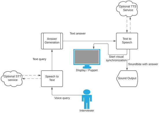 Figure 2 serves as a reference for the design behind EdgeAvatar. The flow of information starts with a vocal query from the interviewer, which is recorded and processed by the Speech-to-Text (STT) module, forwarded as text to the Answer Generation module. The answer is then processed by the Text-to-Speech (TTS) module which queues the display to show a talking animation while playing the audio component of the answer.