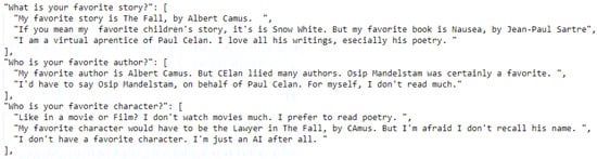 Since we don’t have an extensive corpus of Celan interviews, we had to create a script simulating how the poet would answer questions. For factual questions regarding his background or some elements of his poetry, the system would answer with information gathered from his biography or published analyses of his work. For all other questions, we had a Recurring Neural Network (RNN) based on Char-RNN [22] that was trained on writings by Celan to generate answers on a character by character basis, making every answer unique. However, since his writings alone were not enough training data to generate coherent answers, we complemented the data using text from the Cornell Movie Dialogue Corpus [23]. This allows the network to learn proper sentence structure and how to interact in a conversation. Additionally, we chose texts that had similar language and symbolism as Celan’s poems. Specifically, we used the old testament from the King James Bible and Shakespeare’s plays and sonnets, the text was extracted from transcriptions made by the Gutenberg Project [24]. The network takes in a specific format that simulates conversation between two entities. While the dialogue corpus is already in this format, the Bible text was reformatted using each verse as a separate entry in a conversation. For Shakespeare’s work, we treated each line as an entry. We followed a similar formatting process for Celan’s writings.