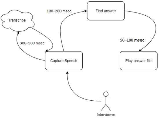 As mentioned in a previous section, the total delay between asking a question and receiving an answer should be within the chosen range of 200 to 2000 msec. If retrieving an answer takes longer than 2 s, we play a single filler answer prior to the actual one. This gives the system an extra 2 s to respond. When using the Azure transcription service, the question is uploaded in real time at 256 Kbps; therefore, the latency is insignificant as long as the internet connection can support it. While running tests, as long as the upload speed is over 1 Mbps, we didn’t observe any upload latency. Afterwards, the text is sent to the answer generation module. Receiving the text and generating an output (answer) adds 100–200 msec to the total delay. The final step is to find and play the audio file for that answer which adds 50–100 msec. Therefore, as long as there is a stable internet connection and the process is not interrupted, we can generate answers with a delay of 450–800 msec, which falls within the acceptable threshold (see Figure 7).