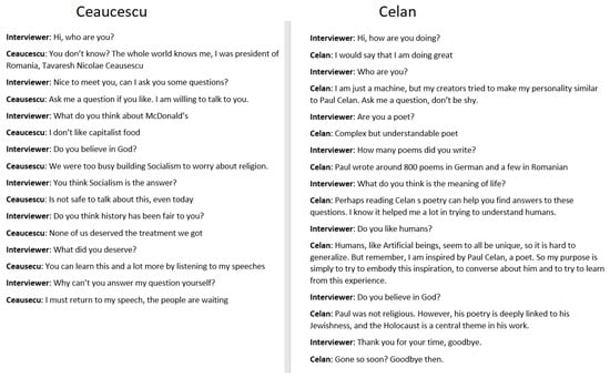 This is a transcription of a conversation excerpt with Ceausescu (left) and Celan (right) which shows how the interactions have a different tone, even though the questions are similar.
