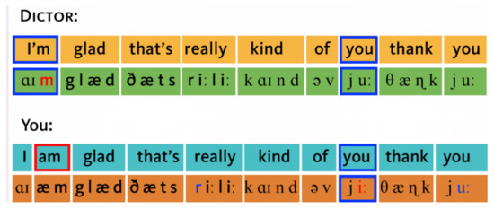 63]. This involves students learning IPA symbols and leads them to acquire a skill of phonetic reading, which consequently corrects some habitual mistakes, e.g., voiced ð and voiceless θ mispronunciation or weak form elimination. Using transcription, connected speech events can be explained, the connected speech phenomena of a model speech may be displayed and the difference between phonemes of a model and a learner may garner hints on how to speak in a foreign language more naturally.