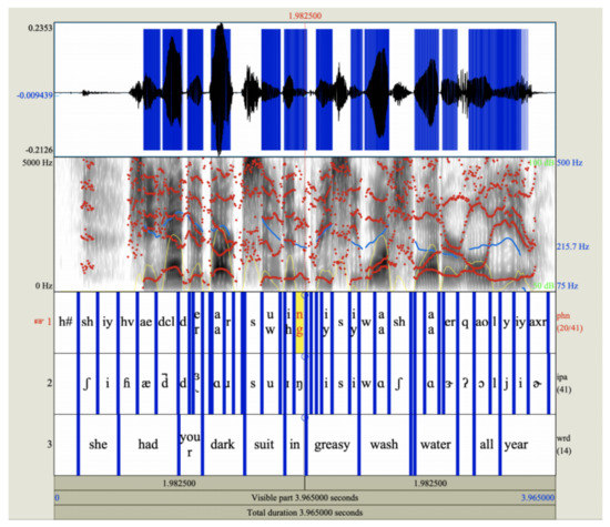 38]. This method achieved segmentation accuracy of 93%. It is possible to increase the accuracy by adding manually selected words that do not lend themselves to the common rule. At this stage, it is also necessary to take into account the pauses between syllables and syllable duration for the subsequent rhythmic pattern retrieval. We store the data of syllables and pauses in the following data structure: data type; syllable or pause; duration; start time; maximum energy on a data interval; and an array of phonemes included. In the case of a pause the maximum energy is taken to be zero, and the array of phonemes contains the phoneme, defining silence, labeled SIL in LibriSpeech. The duration of a syllable or pause is calculated as the sum of all phoneme durations of a syllable. Relative start time is assumed as the start time of the first phoneme in the syllable.