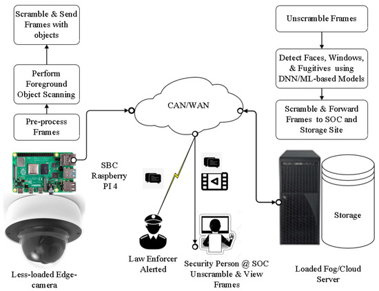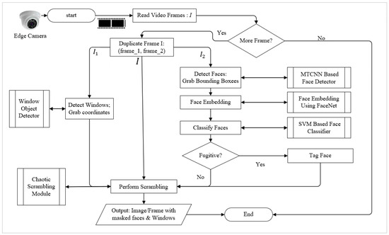 Hybrid Architecture of the PriSE system: The edge camera creates frames, performs foreground object scanning and encrypts frames. The cloud/fog server deciphers frames, detects and masks windows and faces, and performs fugitive face matching.