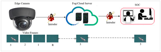 In Algorithm 1, and refer to the current system time and the time recorded after an hour to update the . is the difference of and . The to_gray() method converts a colored frame into gray-scale. The vectorized_xor() method computes the difference of the input and reference frames pairing pixel-wise in parallel. Eventually, the count_pixel() methods counts the number of non-zero pixels in the difference frame, based on which a decision is made on whether to forward or not the frame. Figure 3 portrays that only frame number 3 is forwarded from the edge camera to the fog/cloud server and then to the surveillance operation center (SOC) because it contains a foreground object. However, frames numbered 1 and 2 are discarded because they are the same as/similar to the reference background frame labeled R or contain no foreground objects. This way, a great deal of computational and network resources saved saved.