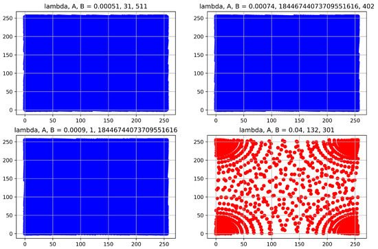 Figure 4 demonstrates that the three scatter plots, colored blue, are secure because the values of and other parameters employed to generate the chaotic outputs are within the range of their respective secure domains defined in Table 1. However, the one in red color is not a good chaos; it has some patterns. This is due to the fact that the value of employed is 0.04, which is out of its secure domain. Parameters A and B can assume any positive numeric value as big as the computer where this module runs can support, as long as the value of is within the secure range. However, for computational efficiency, the values of parameters A and B are constrained to domains and , respectively. The variable t can assume a value as big as the size of the 2D-chaos intended to be generated, , where H and W are, respectively, the height and width of the chaos.