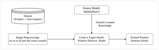 To train and create window-detector model on Tensorflow based on MobileNetv2 [54], we created a dataset comprising 27,000 images, out of which 50% of them contain windows and the rest are walls or images that contain no windows, downloaded and web-scrapped from the Internet because there is not a publicly available dataset for windows. Basically, sixteen types of windows are considered, which are of different types, orientations, style, color intensity, and material. An approach based on the transfer learning technique is employed which allows the generation of an accurate model using a medium image dataset size. As portrayed in Figure 7, knowledge was transferred into the target model from the MobileNetv2 network that was trained on the huge COCO17 dataset. The model construction process includes major tasks such as dataset pre-processing, training a TensorFLow model, and inference. In the pre-processing phase, the input images are first resized to a size of so as to fit into the source model. Then, the images are labeled and mapped using the Python Label Image package. A sample of sixteen types of labeled windows is shown in Figure 8. Secondly, a model that detects window-objects is trained by leveraging the Transfer Learning technique and the TensorFlow Object Detection application programming interface (API). Once the model has been created, the inference process is achieved using the OpenCV-python. For the purpose of the transfer learning, a pre-trained model (ssd_mobileNetv2_320×320_coco17) cloned from the TensorFlow Model Garden was employed for the detector model.