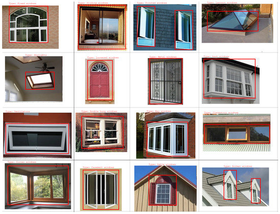 Window objects: sixteen types of windows, namely fixed windows, sliding windows, pivoted windows, lantern windows, skylights, louvered windows, metal windows, sash windows, ventilators, double hung windows, bay windows, clerestory windows, corner windows, casement windows, gable windows, and dormer windows are considered in the training and testing processes [55].