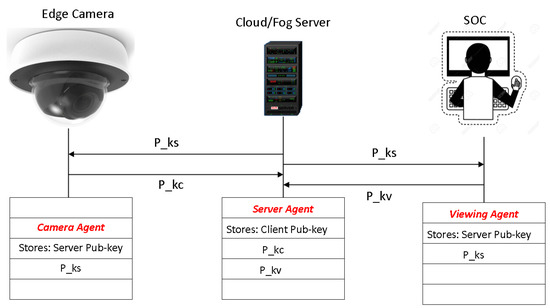 Figure 2 shows that video streams are transmitted from cameras to the fog/cloud server, and then from the fog/cloud server to the viewing stations in encrypted form. Hence, a client-server architecture based lightweight agents are employed for efficiently managing the key distribution as shown in Figure 9. The key is generated in the form of list data structure, , where , and the keys for the three channels of input frame. Camera, server, and viewing-station agents are developed and deployed. The camera agent stores the public key of the server agent, and generates a session key, as described in Algorithm 2, for every frame scrambling. The server agent keeps record of the public keys of all clients for the purpose of secure session key exchange. The viewing-station agent unscrambles frames to be viewed live by security personnel in a security operations center (SOC). It keeps the public key of the server for recovering a session key that is used to decipher encrypted frames forwarded by the server. In addition to the transit of video streams in encrypted form, the public keys are also employed for the exchange of security authentication to prove the authenticity and integrity of devices.