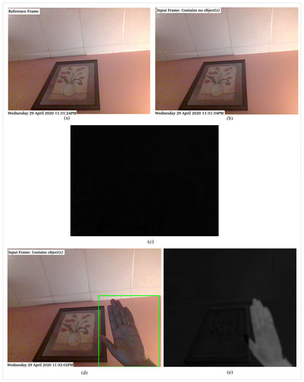 Raspberry PI-camera-1 Motion Detection: (a) reference frame, (b) next frame with no change, (c) a null frame which is the difference of (a,b), (d) frame with a hand object, and (e) a black-and-white frame containing only a hand object which is the difference of (a,d).