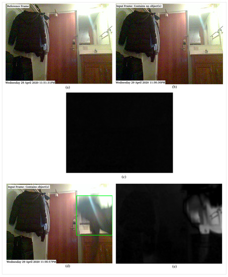 This subsection demonstrates how the relatively static or unchanging backgrounds of video frames created by fixed CCTV cameras can be exploited to improve the processing speed, and reduce the bandwidth and storage requirements. Figure 10 and Figure 11 demonstrate how the simple motion detection algorithm works using video frames captured by two cameras with Raspberry PI. The first frame in Figure 10a captured by PI-camera-1 is employed as a reference against which subsequent frames are compared to check if there is any motion. The next frame in Figure 10b is similar to the reference frame. As a result, their difference becomes null or a black frame illustrated in Figure 10c. However, the frame in Figure 10d contains a hand object and its difference with the reference frame is a hand as portrayed in Figure 10e. Likewise, Figure 11 shows motion detection process on PI-camera-2. Just like the previous case, frames (a) and (b) in Figure 11 are a reference frame and a next frame similar to the reference frame respectively. As a result, their difference is null as shown in Figure 11c. However, the frame in Figure 11d has obviously a fast-moving object (blurred due to speed). Consequently, the difference between the reference frame and the frame (d) in Figure 11 is illustrated in Figure 11e.