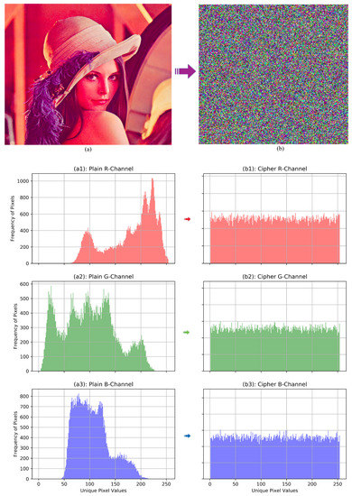 At last, Equations (11) show how the pixel values of the red (R), green (G), and blue (B) channels of the chaos used for scrambling a frame are generated. Each color channel uses different set of keys as portrayed in Equation (10). That is to say, a secure 2D-chaos (Equations (11) is produced for each color channel using the corresponding keys (Equation (10), ).