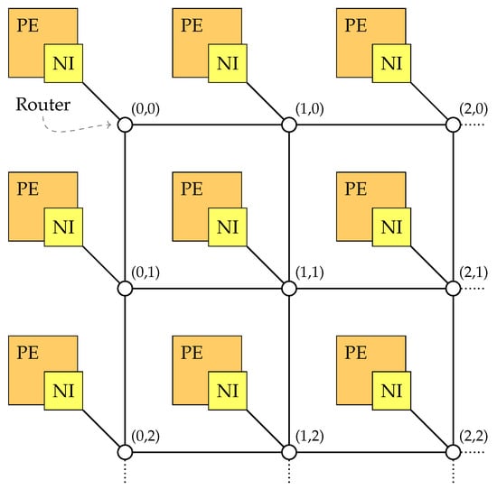Example Networks-on-Chip (NoC) topology (2D mesh) with attached processing elements (PE) and network interfaces (NI).