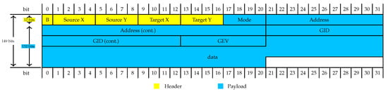 The data interface between PE and NI will be 64 bit wide, i.e., a single data chunk will be of size 64 bit. To prepare this data for transmission through the NoC, the NI will add the following meta-data to it: The payload itself is extended by a 24-bit flit identifier FID (corresponding to network coded transmission, Section 3.2), which enables a unique identification in case of retransmission.Hence, the payload is composed of a mode field (4 bit) specifying the flit type, an address field (32 bit) for memory accesses, the 24-bit FID, and 64 bits of data. Furthermore, a header is added, which contains the information to route the flit through the NoC. This header is composed of a single bit indicating burst transmission (burst mode will be considered in future work) as well as x and y coordinates of source and target nodes. To support a 2D mesh of up to modules, we assume 4 bits for each coordinate. Hence, in total, the single flits exiting the NI will be 141 bits long.